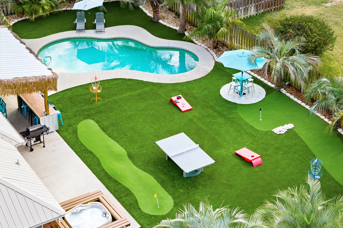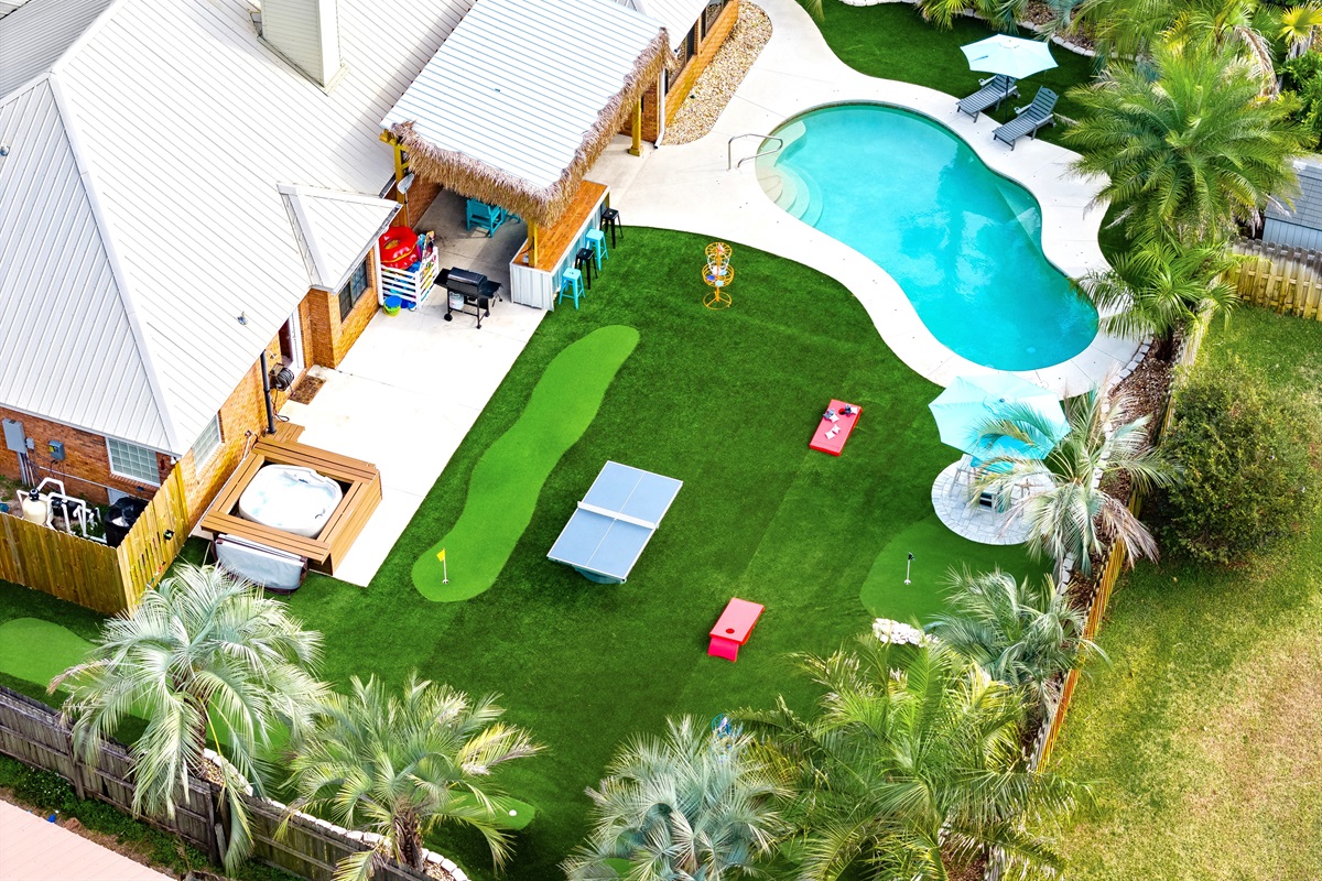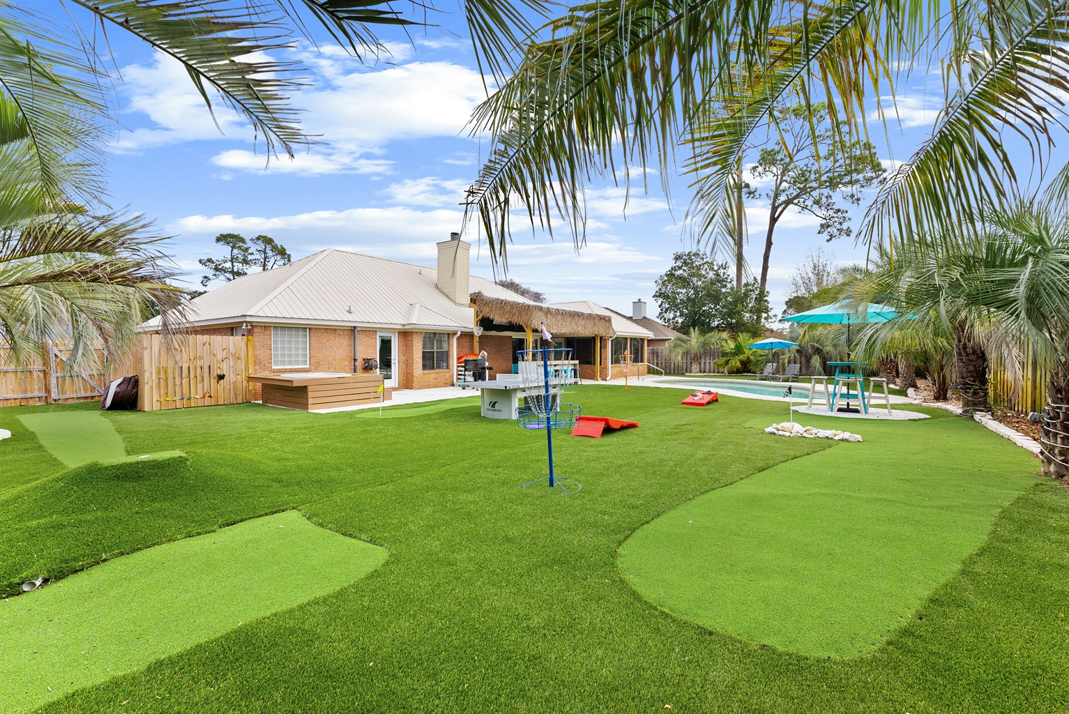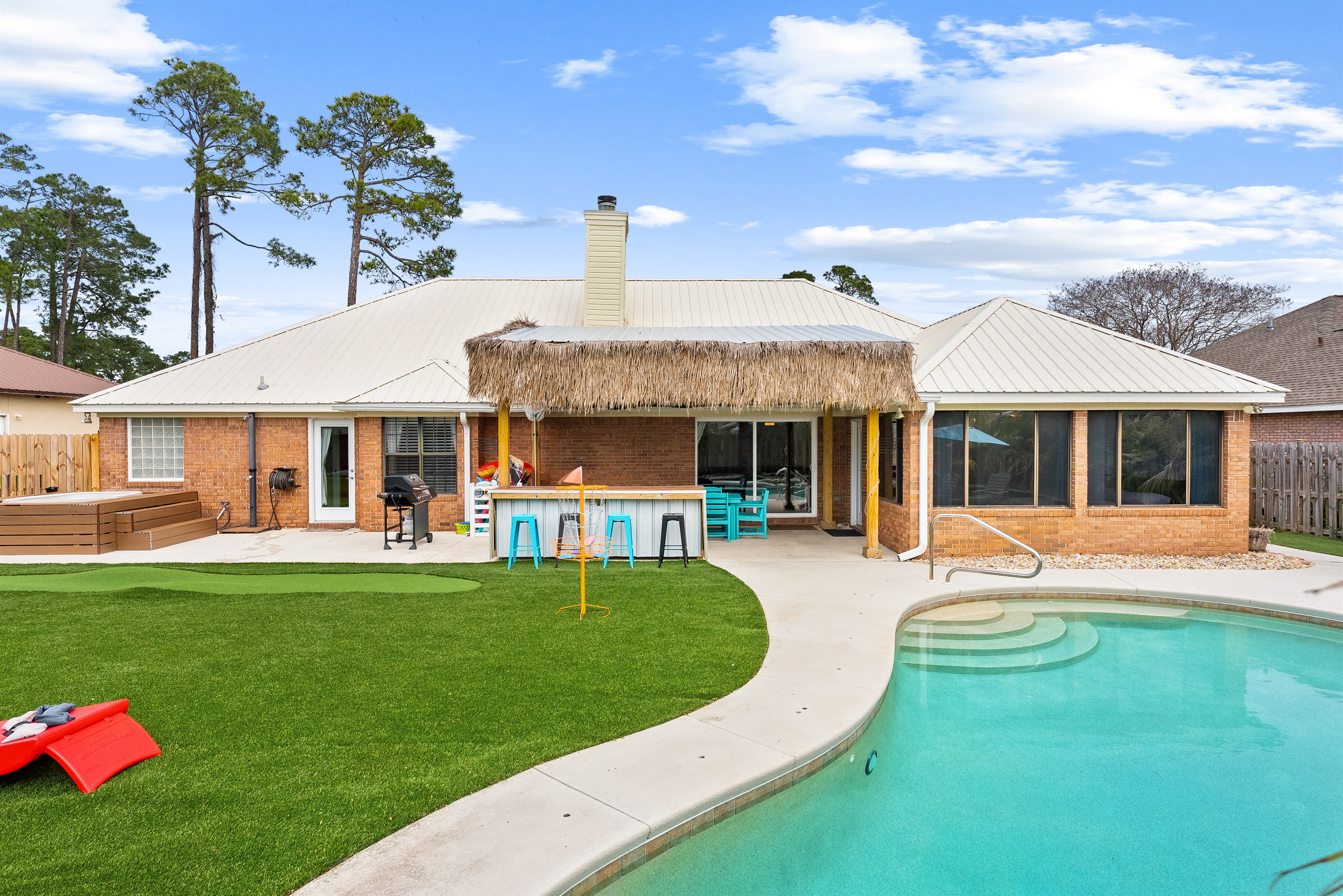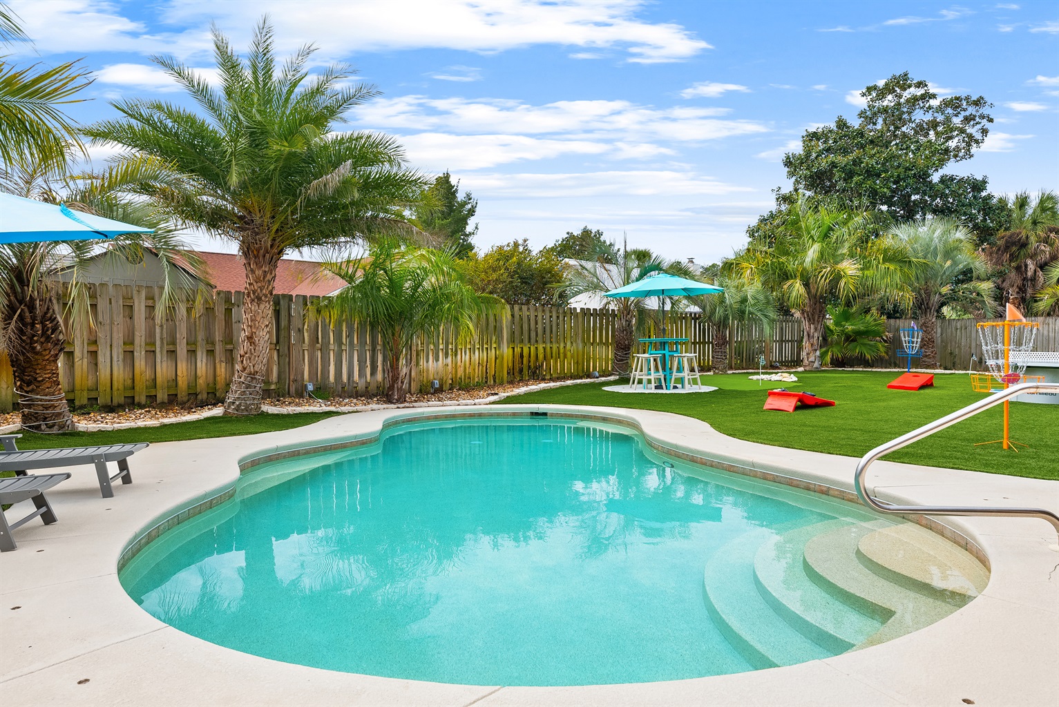 5 Bedrooms • 2 Bathrooms 2 Baths • Sleeps 1-14High Tide offers an unmatched Caribbean experience that is only 5 minutes from the beach. The backyard has a unique 3-course mini golf, disc golf, ping pong, corn hole, shaded seating area, grill with tiki bar and a large dining table to enjoy your meals poolside. It doesn't get much better than that! Looking to just relax and soak up the sun? No problem! The heated salt water pool is a great place to float around in or lounge on the sunny deck. When the sun goes down the fun doesn't end, you can enjoy a nice soak in the 4 person hot tub or listen to the sounds of nature while sitting at the tiki bar with a 70" T.V We are located so close to the beach with that Caribbean feel right in the backyard. Next head inside to an unmatched game room that consists of an air hockey table, pool table, darts, TV, pub tables and an arcade machine with 20,000+ games! There's fun for everyone!