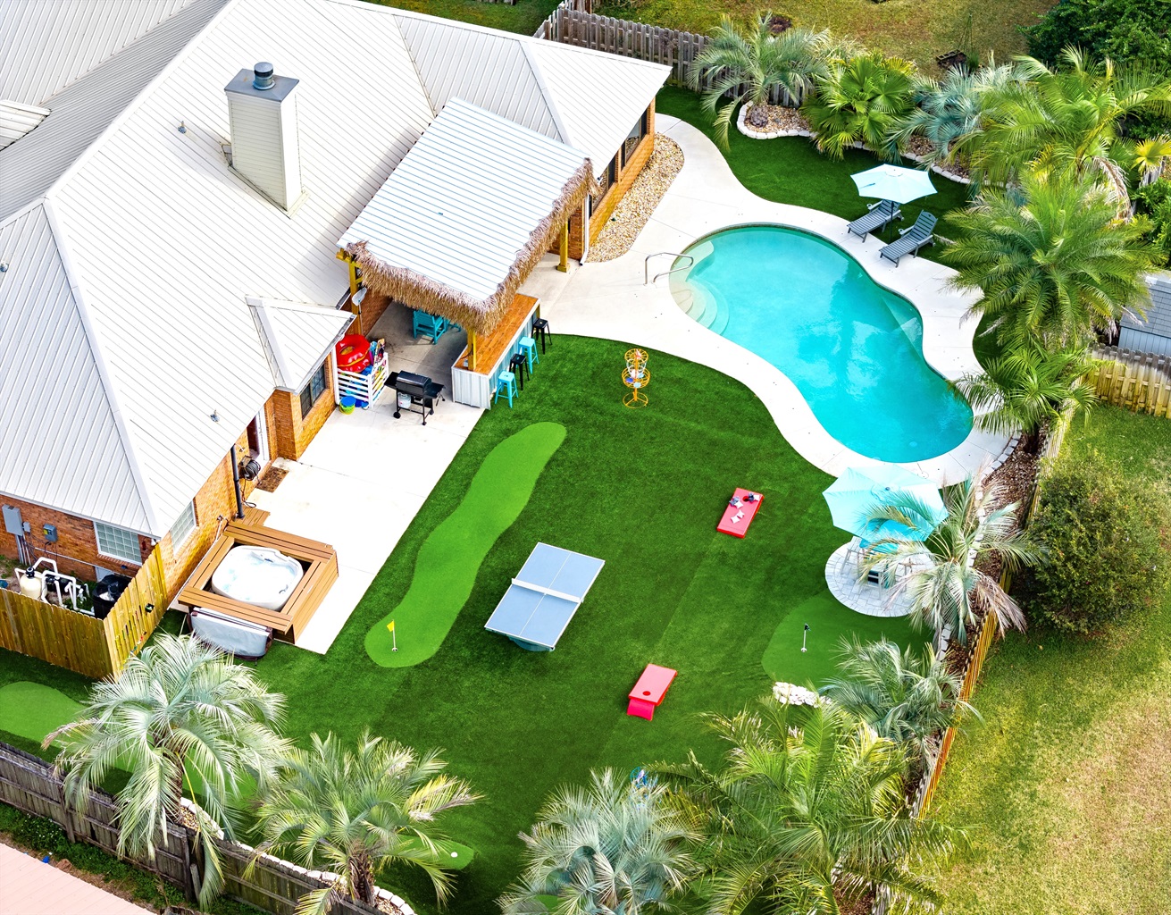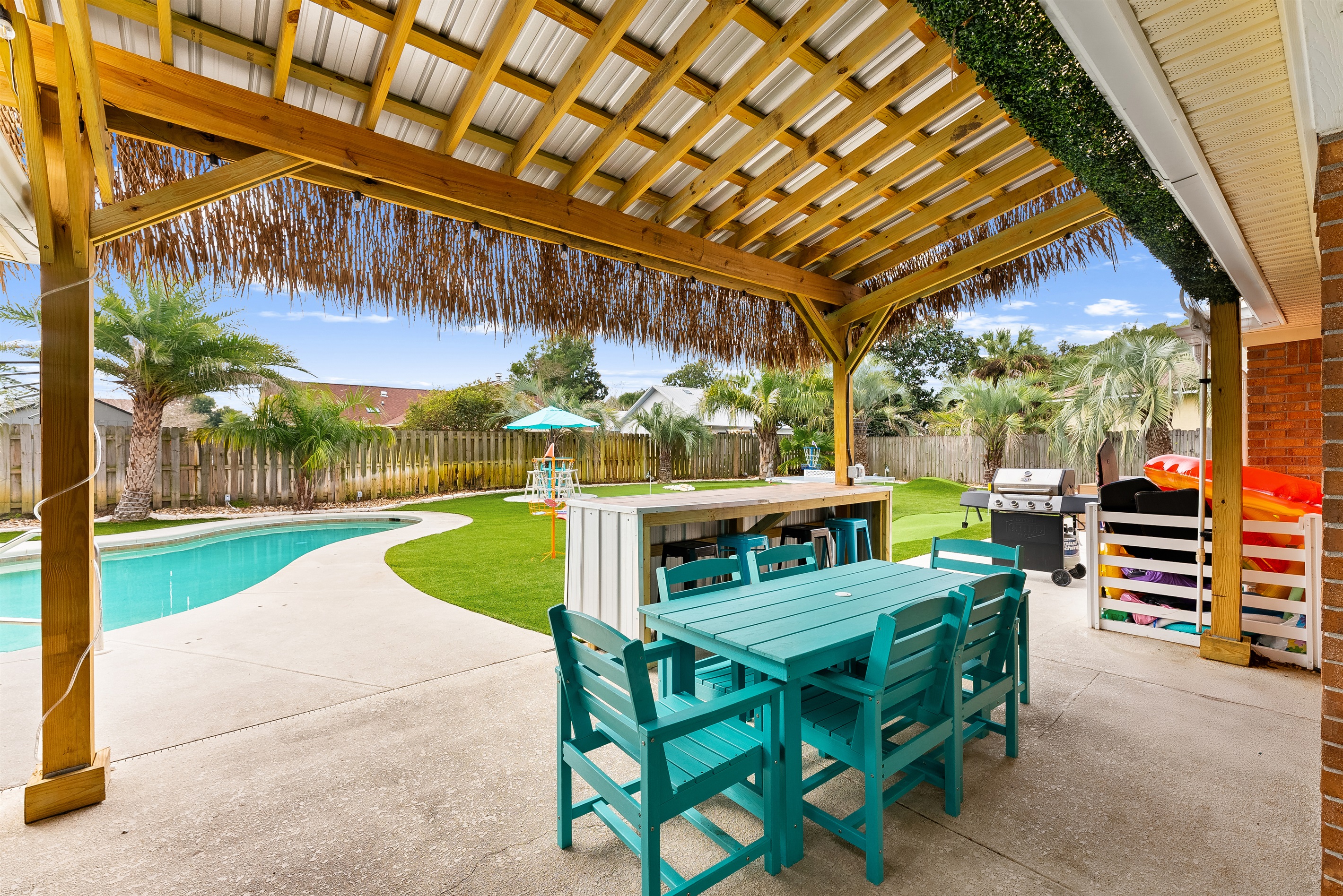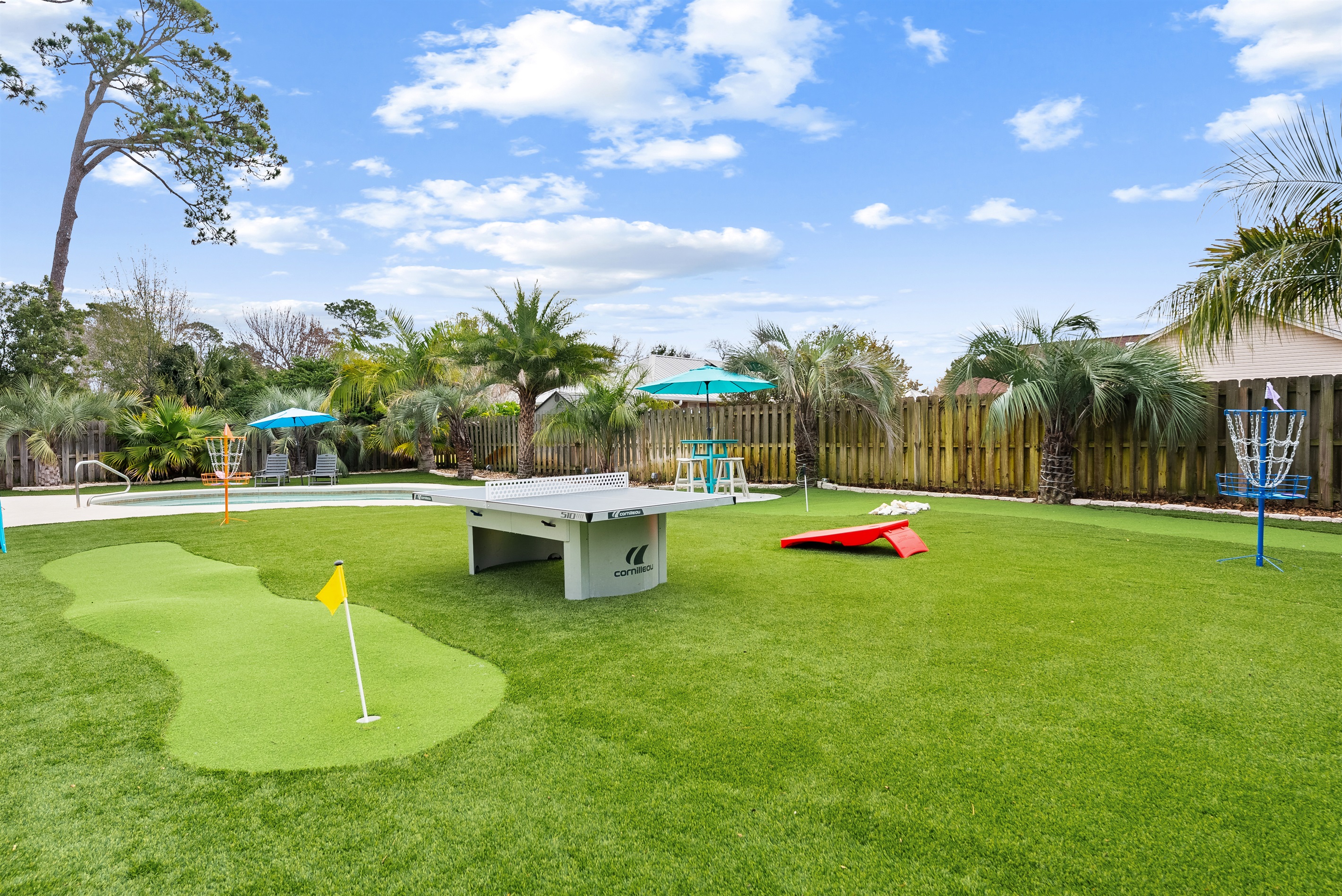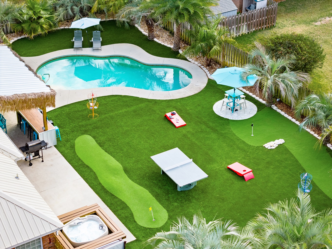 5 Bedrooms • 2 Bathrooms 2 Baths • Sleeps 1-14High Tide offers an unmatched Caribbean experience that is only 5 minutes from the beach. The backyard has a unique 3-course mini golf, disc golf, ping pong, corn hole, shaded seating area, grill with tiki bar and a large dining table to enjoy your meals poolside. It doesn't get much better than that! Looking to just relax and soak up the sun? No problem! The heated salt water pool is a great place to float around in or lounge on the sunny deck. When the sun goes down the fun doesn't end, you can enjoy a nice soak in the 4 person hot tub or listen to the sounds of nature while sitting at the tiki bar with a 70" T.V We are located so close to the beach with that Caribbean feel right in the backyard. Next head inside to an unmatched game room that consists of an air hockey table, pool table, darts, TV, pub tables and an arcade machine with 20,000+ games! There's fun for everyone!